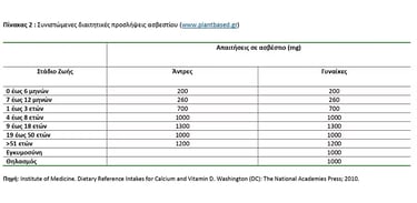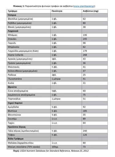 Στον παρακάτω πίνακα φαίνονται οι πιο πλούσιες σε ασβέστιο τροφές στην χορτοφαγία και η περιεκτικότητά τους σε mg. Πολλές πληροφορίες για κατανάλωση ασβεστίου από φυτικές τροφές, μπορείτε να βρείτε και στο βιβλίο «Κρέας; Όχι ευχαριστώ. Οδηγός διατροφής για χορτοφάγους», που αποτελεί το πρώτο πλήρες επιστημονικό διαιτολογικό βιβλίο στον Ελληνικό εκδοτικό χώρο.