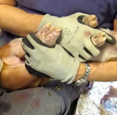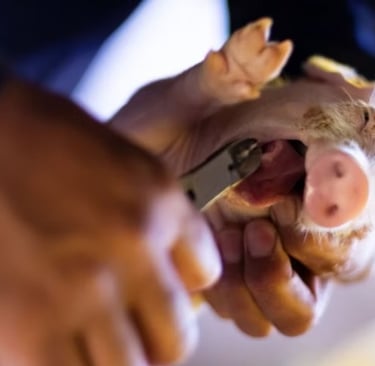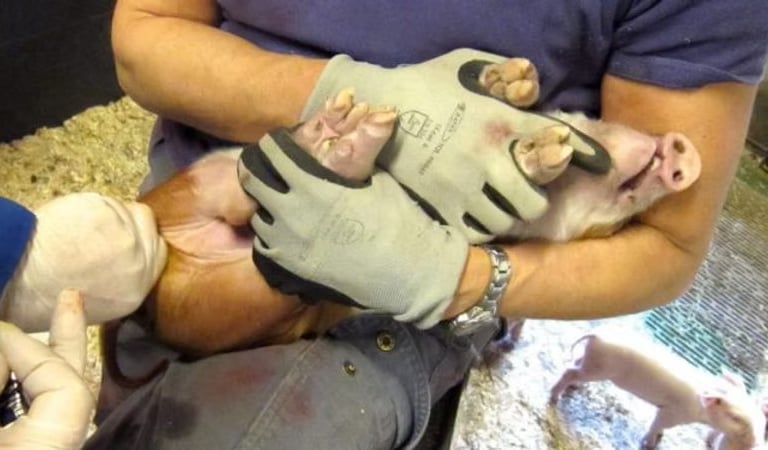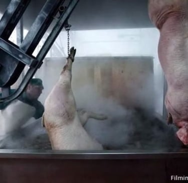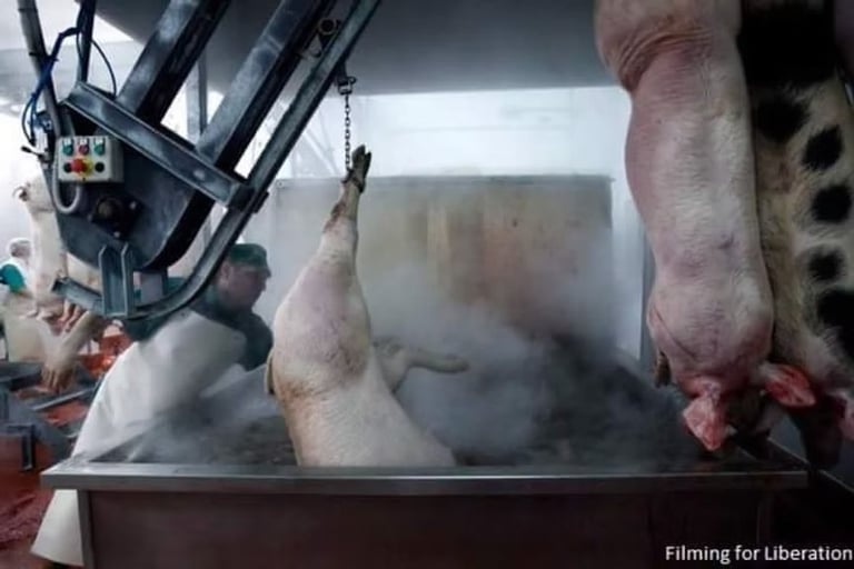 Ένα τυπικό σφαγείο σκοτώνει τόσα πολλά γουρουνάκια ανά ώρα, ώστε καθίσταται αδύνατη η σωστή αναισθητοποίηση τους και μετά τη σφαγή τους σε ένα μεγάλο ποσοστό, φτάνουν ζωντανά και με πλήρεις αισθήσεις στις δεξαμενές με το καυτό νερό, που χρησιμεύουν για να μαλακώσει το δέρμα και να φύγουν οι τρίχες. Παίρνει αρκετά λεπτά να ξεψυχήσουν,μισοσφαγμένα μέσα στο βραστό νερό κ ενώ αγωνίζονται να βγουν.