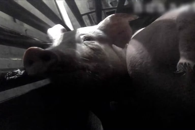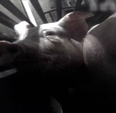 Στάδιο 1: Το πρώτο στάδιο περιλαμβάνει την αναισθητοποίηση τους. Αυτή γίνεται είτε με ηλεκτροσόκ στο κεφάλι του γουρουνιού, το οποίο μετά πέφτει κάτω και παθαίνει κάτι σαν επιληπτική κρίση, είτε μέσα σε θάλαμο αερίων στον οποίον ουρλιάζουν και υποφέρουν για περίπου 40 δεύτερα. Επειδή όμως η παραγωγή είναι μεγάλη και μέσα σε μία μέρα σφάζονται εκατοντάδες ζώα, αυτό έχει ως αποτέλεσμα η αναισθητοποίηση πολλές φορές να ΜΗΝ γίνεται σωστά. Τι σημαίνει αυτό; Ότι το ζώο διατηρεί τις αισθήσεις του και είναι έτοιμο να βιώσει ό,τι θα ακολουθήσει.