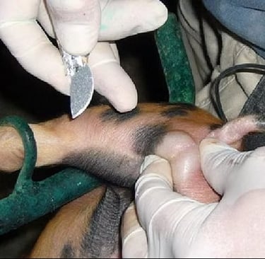 Δεδομένου ότι τα ζώα δεν θεωρούνται τίποτα περισσότερο από περιουσία(τίποτα περισσότερο από ακίνητα), ταυτίζονται με αριθμούς και το αυτί είναι ένα είδος συστήματος αρίθμησης για την οργάνωσή τους. Η ετικέτα του αυτιού βοηθά στην ταυτοποίηση ενός γουρουνιού και δείχνει ποιο είναι, δίνοντας σε κάθε γουρούνι έναν μοναδικό αριθμό ταυτότητας. Οι εγκοπές τοποθετούνται σε μία από τις πέντε θέσεις στο δεξί αυτί του - για να δείξουν τον αριθμό του - και σε μία από τις τρεις θέσεις στο αριστερό αυτί - για να δείξουν τον ατομικό αριθμό του. Ένα τριγωνικό εργαλείο χρησιμοποιείται παρόμοια με μια συσκευή που τρυπάει, για να κάνει τις εγκοπές χωρίς αναισθησία. Η βιομηχανία αποφάσισε να χρησιμοποιήσει την εγκοπή επειδή ήταν πιο βολικό γι 'αυτούς σε σύγκριση με τη χρήση ατομικών ετικετών που χρησιμοποιούνται με τα βοοειδή.