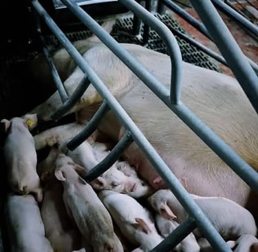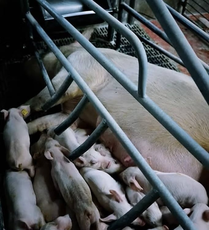 Ο σχεδιασμός χωρίζει σκόπιμα τη μητέρα από τα μικρά της για να αποφευχθεί η σύνθλιψη, αλλά αυτό σημαίνει ότι η μητέρα δεν μπορεί να γυρίσει για να δει τα γουρουνάκια της αλλά μπορεί μόνο να σηκωθεί ή να ξαπλώσει. Στερείται την επαφή με τα μικρά της που είναι τόσο ζωτικής σημασίας ανάμεσα σε μια μητέρα τόσο στοργική όσο η γουρούνα. Τα γουρουνάκια αναγκάζονται να θηλάζουν τη μητέρα τους μέσα από τα κενά μεταξύ των ράβδων και λίγες μέρες αργότερα απομακρύνονται από τις μητέρες τους. Μετά από μια ζωή γεμάτη απόγνωση, απελπισία, πόνο και αλλεπάλληλες γέννες, όταν πια το σακατεμένο της σώμα δεν θα είναι ικανό να φέρνει στη ζωή άλλους απογόνους, θα σταλεί για σφαγή.