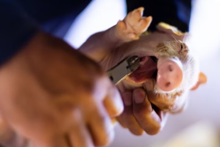 Σύντομα μετά τη γέννησή τους, τα δόντια των γουρουνιών κόβονται. Ο σκοπός της αποκοπής των δοντιών είναι να μειωθούν οι τραυματισμοί που προκαλούνται μεταξύ τους και στη μητέρα τους όπως τα φροντίζει. Οι χοιρομητέρες δεν έχουν πάντα αρκετό γάλα για να τροφοδοτήσουν όλα τα γουρουνάκια τους, ειδικά αν έχουν πολλά μωρά. Αυτό μπορεί να συμβεί εάν η χοιρομητέρα έχει περισσότερα μωρά από ότι μπορεί να φροντίσει,εάν έχει κακή υγεία ή εάν για κάποιο λόγο τρώει πολύ λίγο φαγητό. Για να διασφαλιστεί ότι τουλάχιστον ορισμένα από τα γουρουνάκια επιβιώνουν, ο ισχυρότερος λαμβάνει προνομιακή μεταχείριση. Τα μωρά που βρίσκονται στο μπροστινό μέρος του σώματος της χοιρομητέρας παίρνουν το περισσότερο γάλα. Τα μωρά προς το πίσω μέρος του σώματος παίρνουν λιγότερο γάλα. Τα γουρούνια γεννιούνται με αιχμηρά δόντια για να πολεμούν για τις καλύτερες θηλές. Μόλις ένα γουρούνι έχει κατοχυρώσει την ιδιοκτησία μιας θηλής, αυτός ή αυτή θα το υπερασπιστεί σθεναρά.