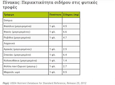 Περισσότερες πληροφορίες για την περιεκτικότητα των φυτικών τροφών σε σίδηρο, θα βρείτε στον παρακάτω πίνακα.